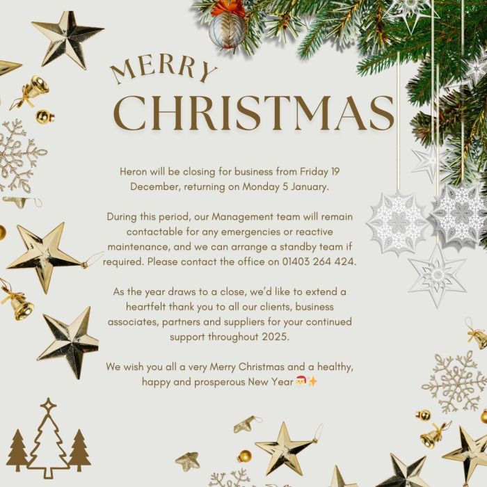 During this period, our Management Team will remain contactable for any emergencies or reactive maintenance, and we can arrange a standby team if required. Please contact the office on 01403 264 424.