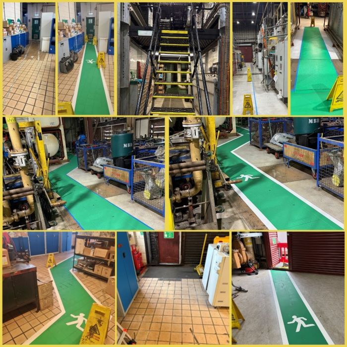 The route was finished with crisp white margins and walking-man icons for clear guidance. The stairs also received attention, with refreshed nosings and newly decorated handrails highlighted in Safety Yellow to enhance visibility and improve overall safety within the space.